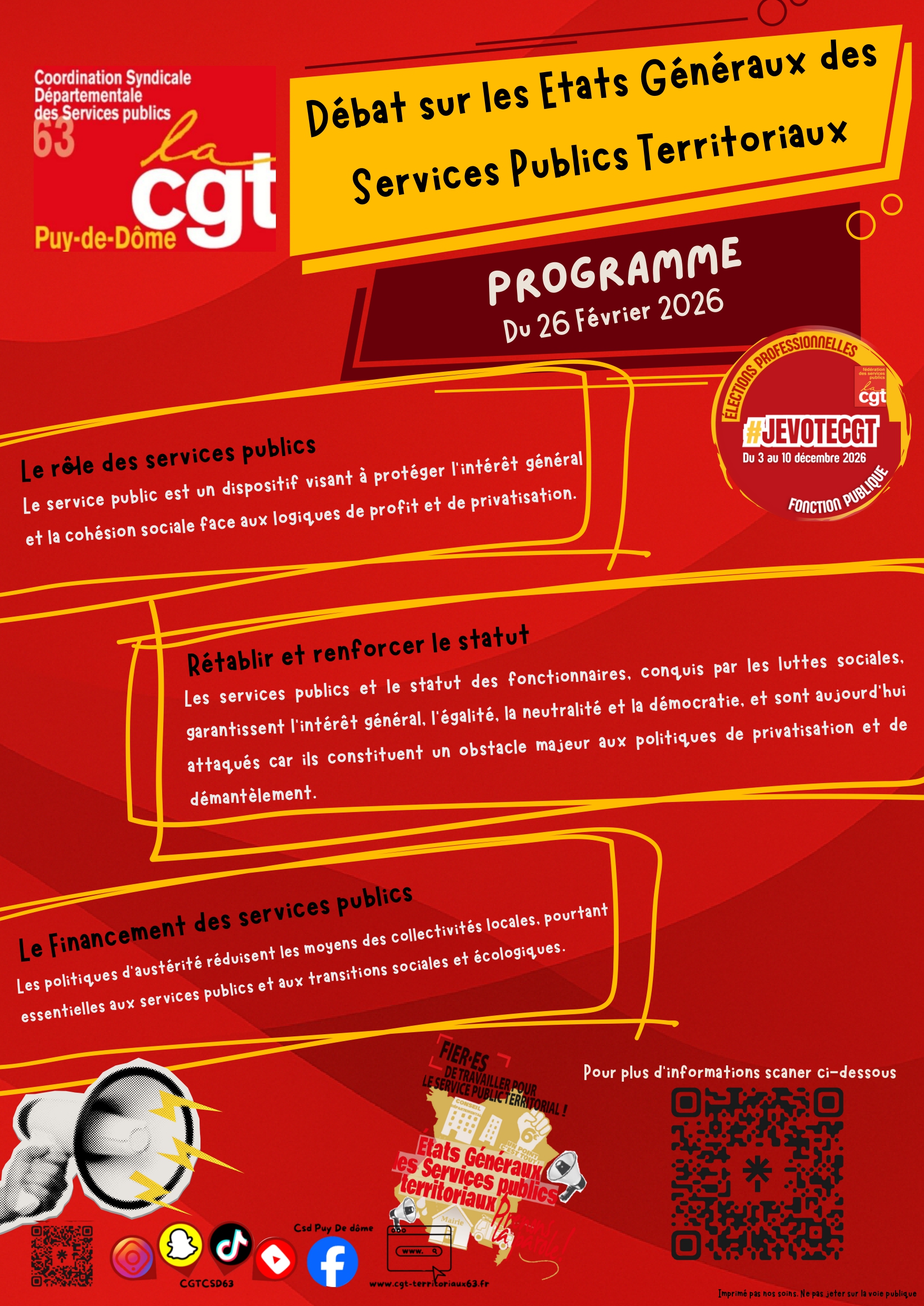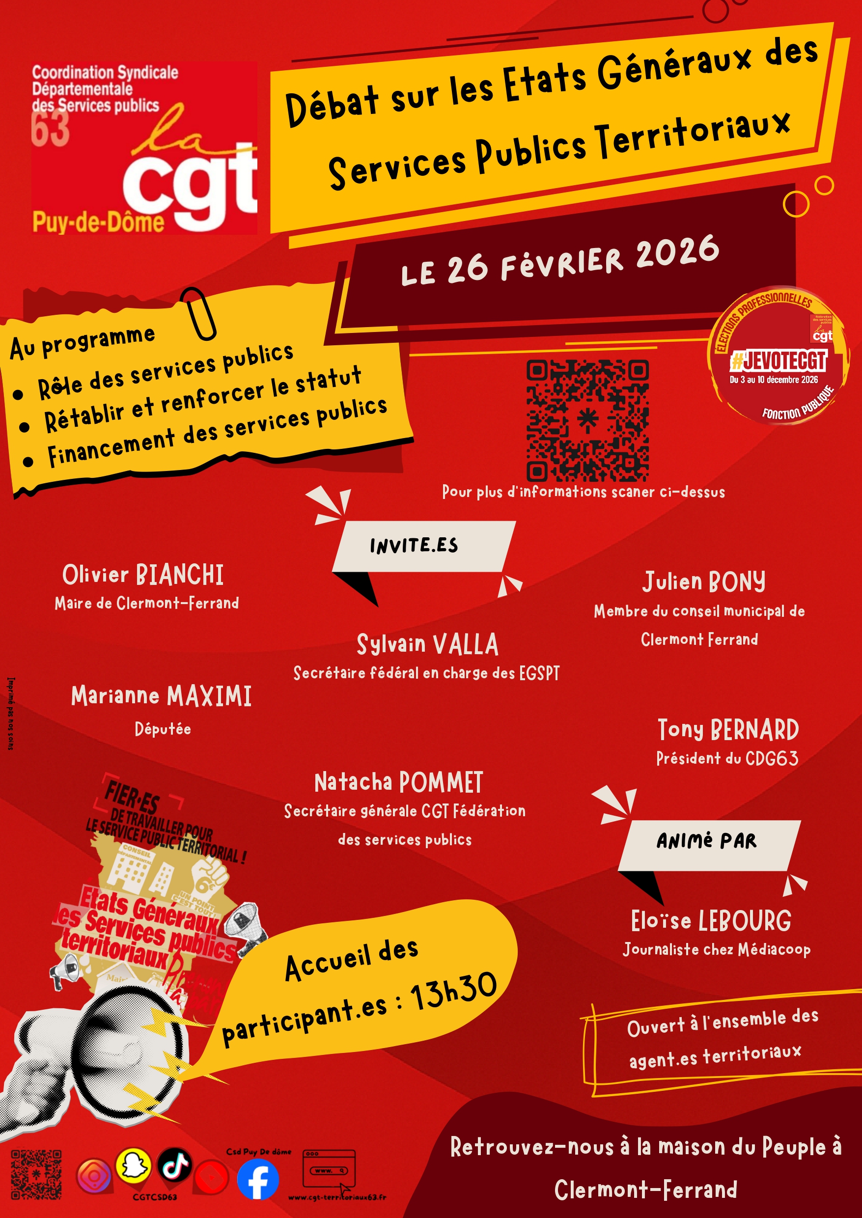 Débat états généraux des services publics territoriaux egspt-financement-comment-repondre-aux-besoins-des-populations Votre Syndicat: CGT Coordination Syndicale Départementale 63 + Ajouter à mon Agenda Google + iCal / Outlook export 00 jours 00 heures 00 minutes 00 secondes Étiquettes : egspt;débat;services publics;agents de la fonction publique; Date Fév 26 2026 Heure 13 h 30 min - 17 h 00 min Lieu Maison du peuple - Salle des fêtes 1 place de la Liberté 630000 Clermont-Ferrand Catégorie Réunion syndicale Organisateur CSD CGT Partagez cet événement